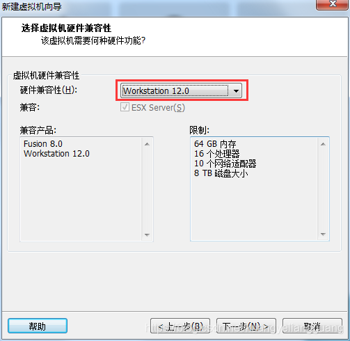选择硬件兼容性(高版本的Workstation可以打开低版本创建的虚拟机,而低版本的Workstation无法打开高版本创建的虚拟机)