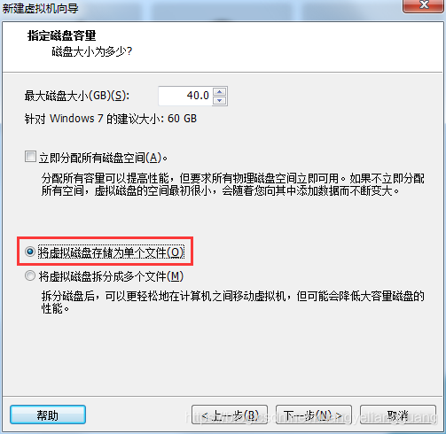 指定合适的硬盘大小(勾选将虚拟机磁盘存储为单个文件,不要勾选“立即分配所有磁盘空间”)