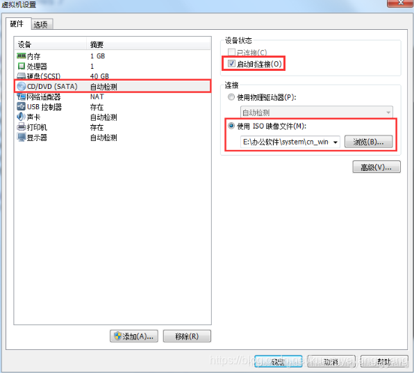 选择CD/DVD,使用iso映像文件,点击确定(这个过程就相当于我们将一张带有系统的光盘放入电脑光驱中)