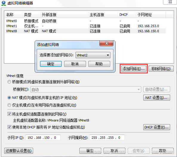 在安装完VMware Workstation之后,默认会生成三种网络接入模式:桥接模式(VMnet0)、仅主机模式(VMnet1)、NAT模式(VMnet8),当然我们也可以自己再添加多个VMnet。在虚拟机中的每一个VMnet我们可以理解为一个网段或者一个交换机,如果要使两台虚拟机之间可以相互通信,就需要将两台虚拟机接入相同的VMnet中;