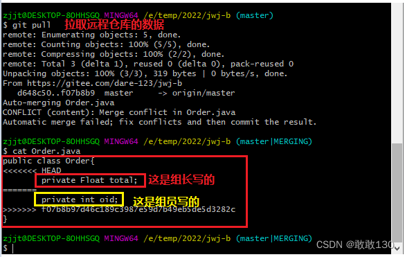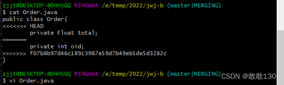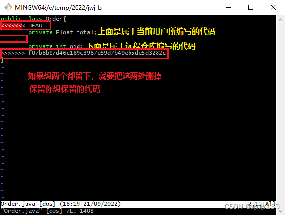 注1:<<<<<<< HEAD >>>>>>>之间的即为冲突的代码,手动修改即可