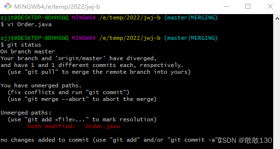 注1:git status查看仓库状态,会显示红色的错误提示消息“ both modified: a.txt”