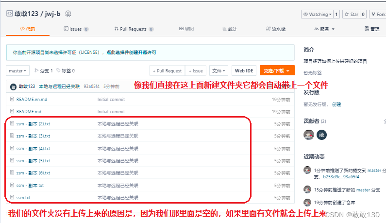 注3:再次添加文件b.txt,依次add/commit/push操作,则与之前没有区别了