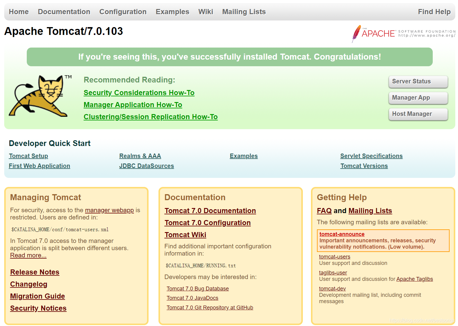 4.打开浏览器,地址栏输入 http://localhost:8080 ,如果看到小猫的首页说明已经安装成功。