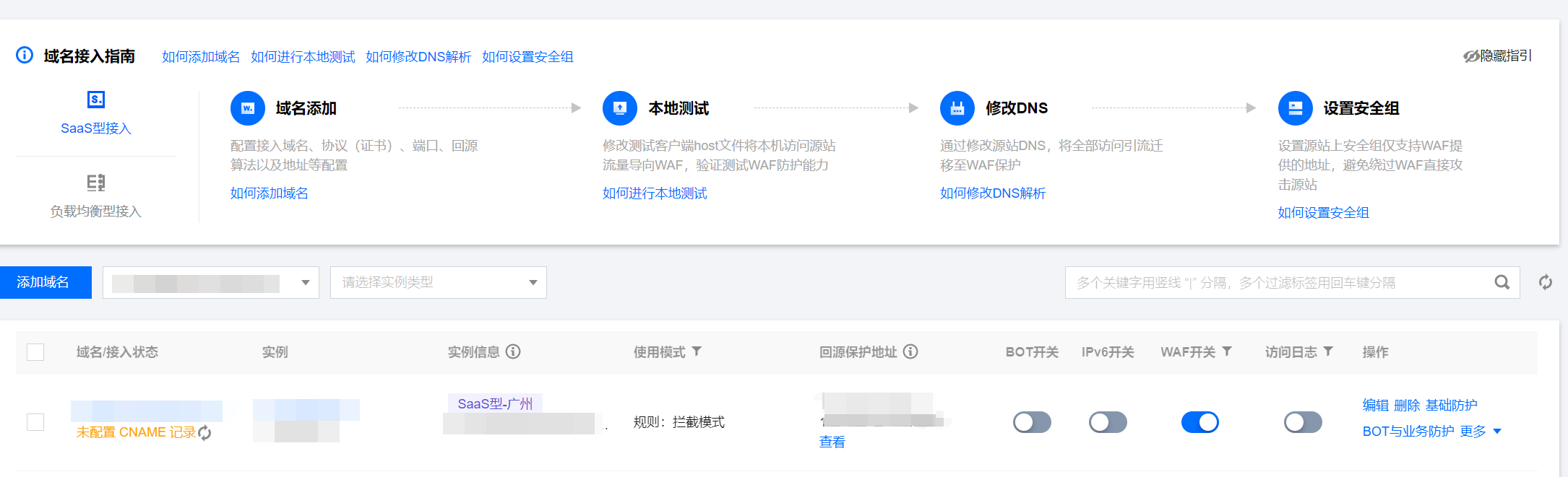 使用 Web 应用防火墙(WAF)防护您的 Web 业务前,需要先将防护的网站接入到 Web 应用防火墙。未完成接入前,您的 Web 应用防火墙防护将无法生效。本文档将指导您如何在 SaaS 型 WAF 中接入域名。