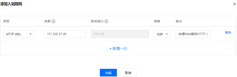 - 在弹出框中填写相关信息,类型选择 “HTTP(80)” ,来源中填写需要放行的回源 IP,根据需求填写端口及策略,填写完毕后,单击完成。