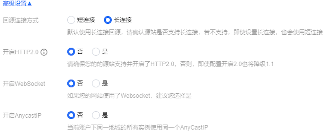 字段说明- 回源连接方式:默认使用长连接回源,请确认源站是否支持长连接,若不支持,即使设置长连接,也会使用短连接。