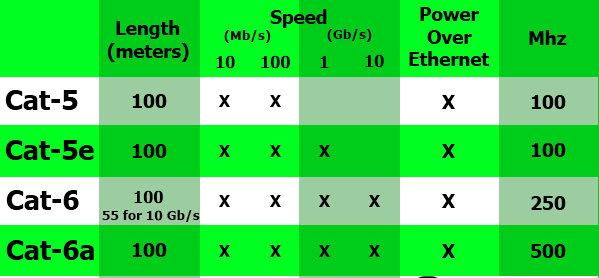 常见的以太网电缆分为顺序编号的类别(Cat5,Cat5e,Cat6,Cat6a)。