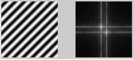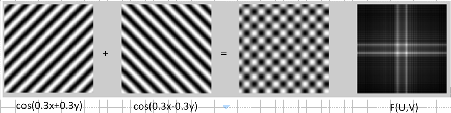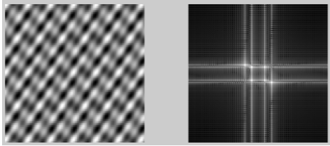 B.图像:cos(0.3x+0.3y)+ cos(0.3x-0.3y),该图像表现为规则点阵,其傅里叶频域图上则按预期的出现4个极值点