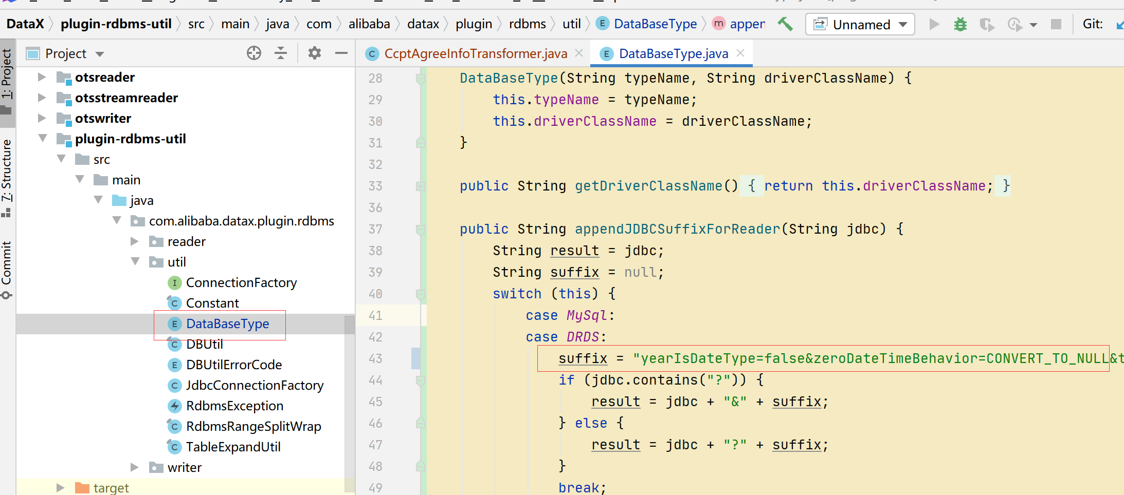 clone dataX源码并用maven构建导入需要的jar包,项目导包完成之后我们找到com.alibaba.datax.plugin.rdbms.util.DataBaseType类,设置zeroDateTimeBehavior=CONVERT_TO_NULL并且在后面添加时区。
