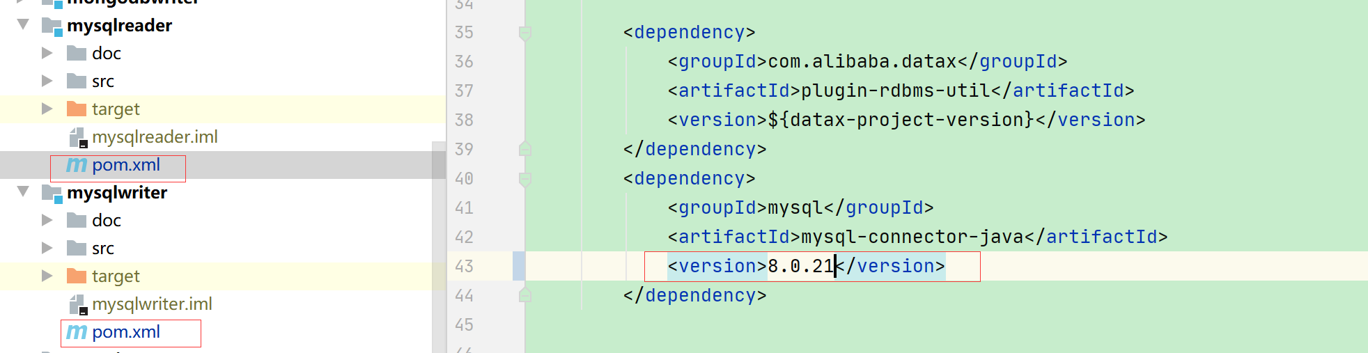 找到源码中mysqlreader和mysqlwriter修改pom文件中mysql的连接驱动为对应的mysql8的驱动,比如我这里用的是8.0.21版本