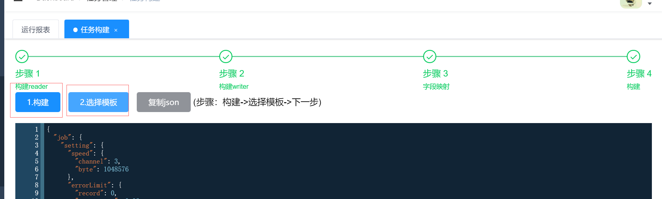 按照步骤构建好任务,最后一步点构建会生成一个json格式的模板,注意json中的reader和writer的列顺序要一致,然后选择模板点下一步就创建成功了。