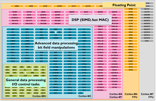 下面是Cortex-M3,M4和M7的指令集爆炸图: