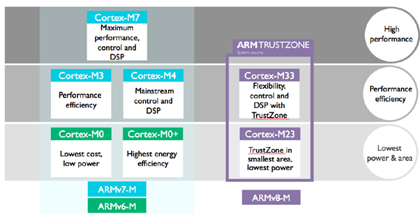 - Cortex-M3,M4和M33是中等性能,其中M3最弱。