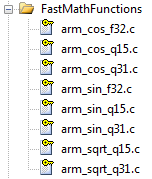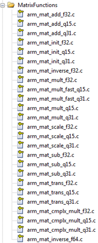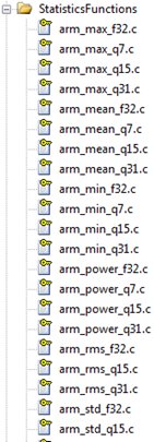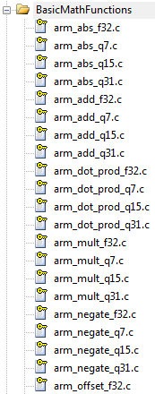 提供了基本的数据运算,如加减乘除等基本运算,以_f32结尾的函数是浮点运算,以_q8, _q15, _q31,结尾的函数是定点运算,下面是部分API截图: