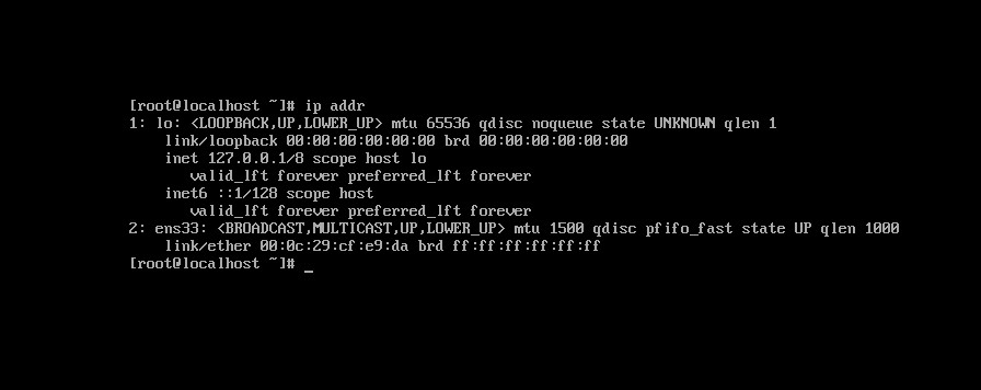 输入ip查询命名 ip addr 也可以输入 ifconfig(centOs7没有ifconfig命令)查看ip,但此命令会出现3个条目,centos的ip地址是ens33条目中的inet值。