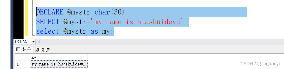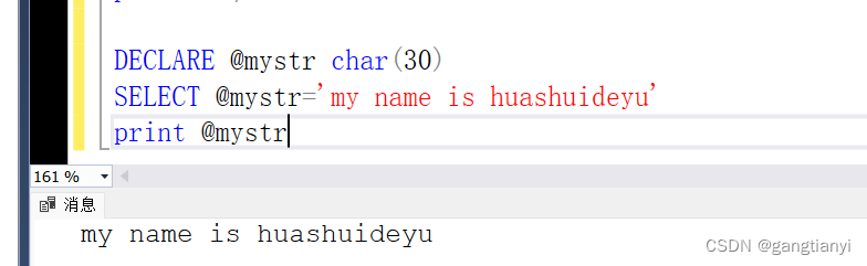 注意:不能直接运行 print @mystr 和select @mystr 必须要跟前面声明和赋值一起