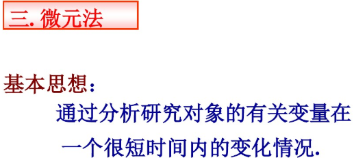 自然界中也有许多现象所满足的规律是通过变量的微元之间的关系式来表达的。对于这类问题,我们不能直接列出自变量和未知函数及其变化率之间的关系式,而是通过微元分析法,利用已知的规律建立一些变量(自变量与未知函数)的微元之间的关系式,