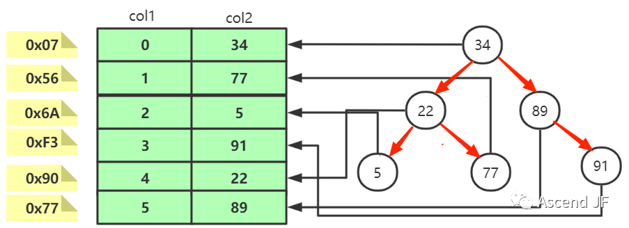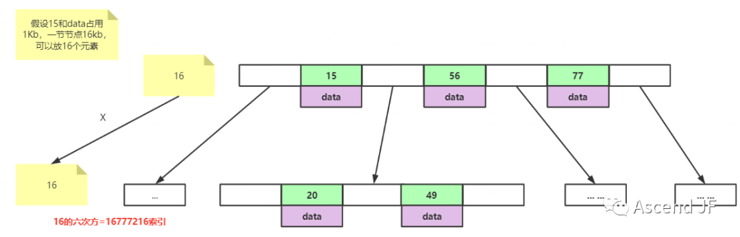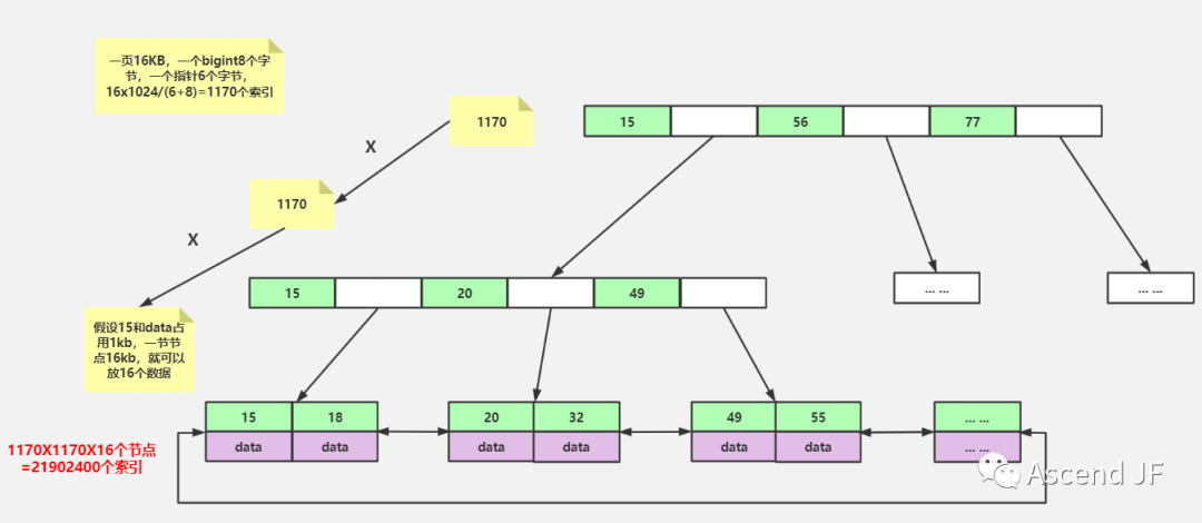 B+Tree只在叶子节点存储数据,所以B+Tree的单个节点的数据量更小,只存储索引,可以放更多的索引,在相同的磁盘I/O次数下,就能查询更多的节点。另外,B+Tree叶子节点采用的是双指针连接,适合MySQL中常见的基于范围的顺序查找,一个节点可以放16kb,1170个元素,1170*1170*16=2千多万,高度为3,即使是2千万数据,B+树的高度为3,这样我们查找数据的效率会比较高,高度是由非叶子节点能放多少个索引元素决定的。