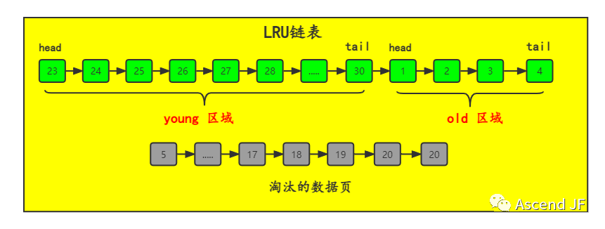 缓冲池缓存的数据包括Data page、Index page、Data Dictionary 等,通常MySQL服务器的80%的物理内存会分配给Buffer Pool。基于效率考虑,InnoDB中数据管理的最小单位为页,默认每页大小为16KB,每页包含若干行数据。为了提高缓存管理效率,InnoDB的缓存池通过页链表实现,很少访问的页会通过缓存池的LRU算法淘汰出去,也就是LRU链表。LRU链表分为两部分:young区域和old区域,从磁盘读取数据页会加入到LRU链表的old区域头部,从old区域数据页中读取行记录进行where进行匹配,old区域中的页被访问,就会将数据页加入到young区域头部,由于是全表扫描(因此所有数据都会被逐个加入young区域头部,从而替换淘汰原有的young区域数据)。