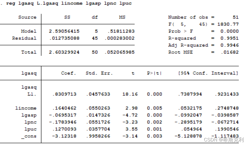 其中,被解释变量lgasq为人均汽油消费量的对数,解释变量lincome为人均收入对数,lgasp为汽油价格指数的对数,lpnc为新车价格指数的对数,lpuc为二手车价格指数的对数。