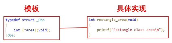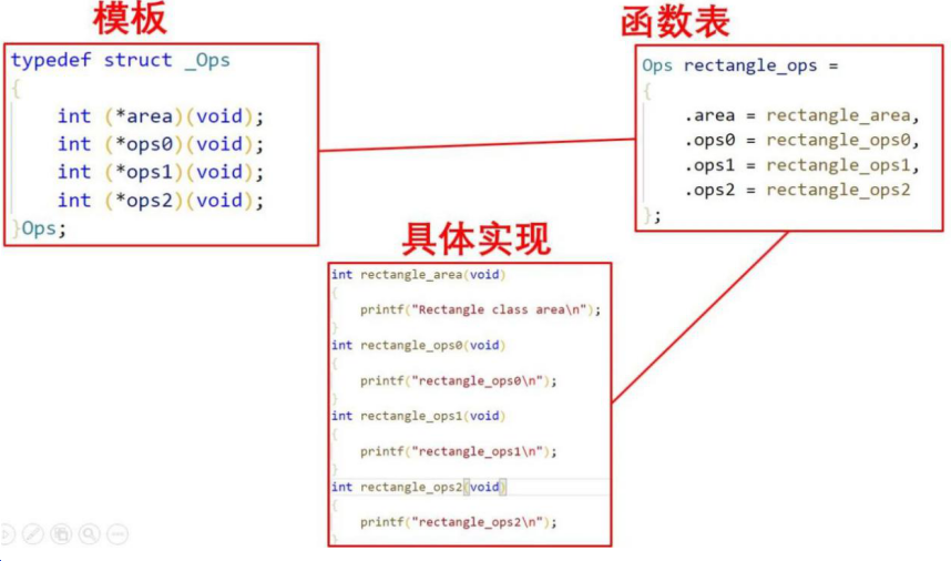 {Rectangle rectangle;memset(&rectangle, 0, sizeof(Rectangle));rectangle.shape.ops.area = rectangle_area; /* 与自己的area函数做绑定 */Triangle triangle;memset(&triangle, 0, sizeof(Triangle));triangle.shape.ops.area = triangle_area; /* 与自己的area函数做绑定 */Shape *shape;shape = (Shape*)&rectangle;shape->ops.area();shape = (Shape*)▵shape->ops.area();return 0;