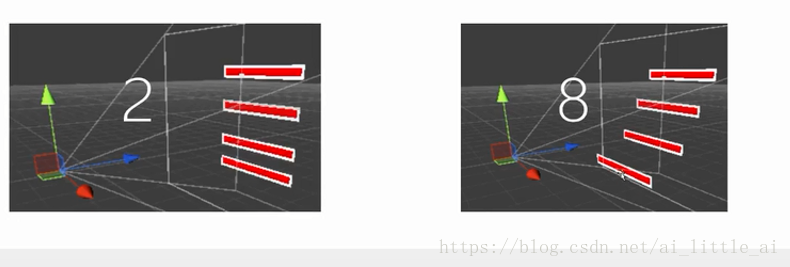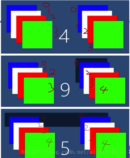 *Z值 != 0 (Unity5.x之后)的情况本来能合批的,也不能合批了,即限制:只能在herighy里相邻的,并且是相同图集的UI元素才可以进行合并。(eg:z=0时,本来所有红色合并一个,白色合并一个。但是z≠0后,因为在herighy层第一组的红色是和第二组的白色挨着的,第二组的红色和第三组的白色是相邻的,因此不能进行合并了)