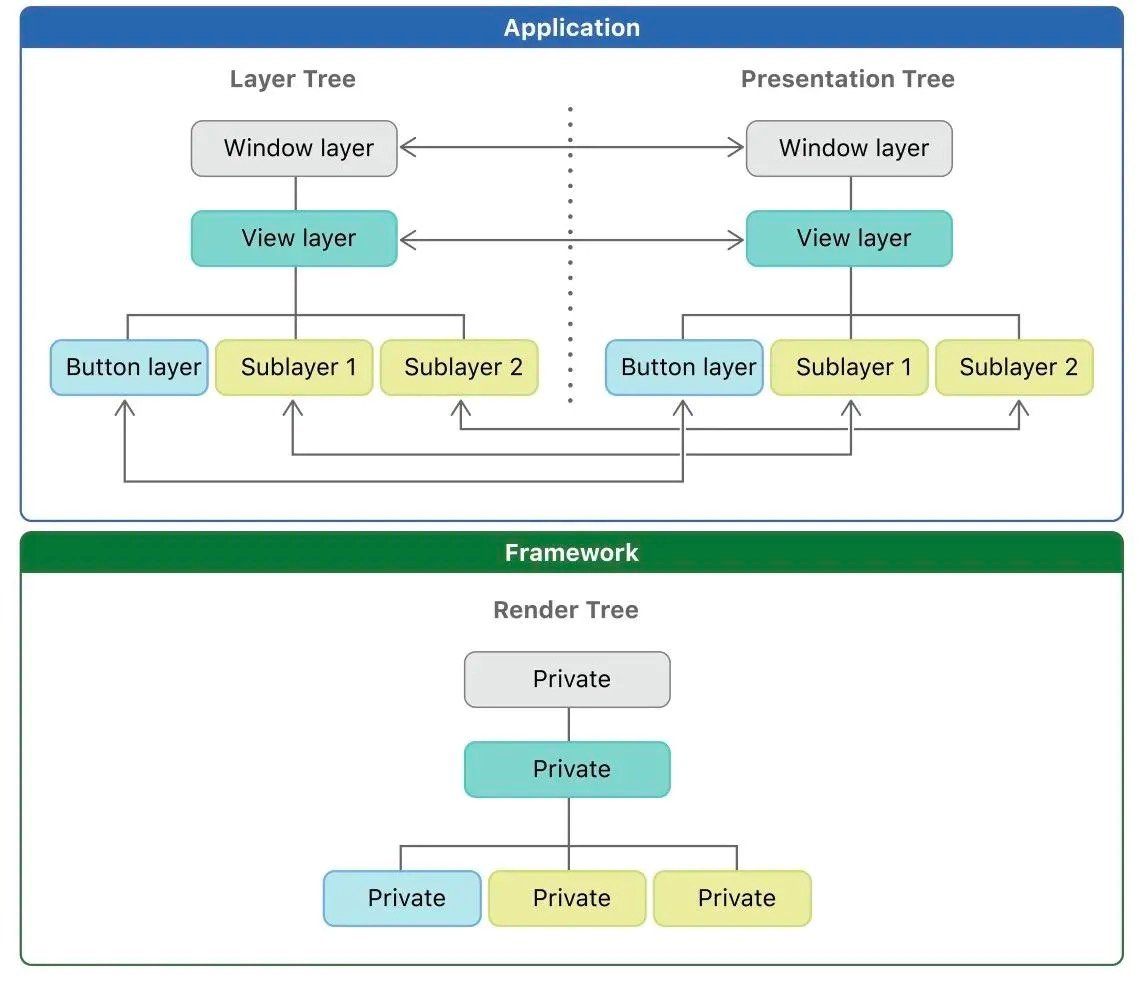 表示图层树 中的对象包含任何正在运行的动画的飞行中值。层树对象包含动画的目标值,而表示树中的对象反映屏幕上显示的当前值。您永远不应该修改此树中的对象。相反,您可以使用这些对象来读取当前动画值,也许是为了从这些值开始创建新动画。