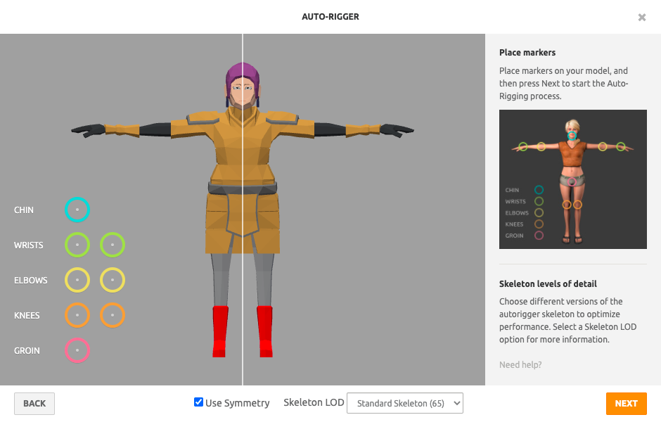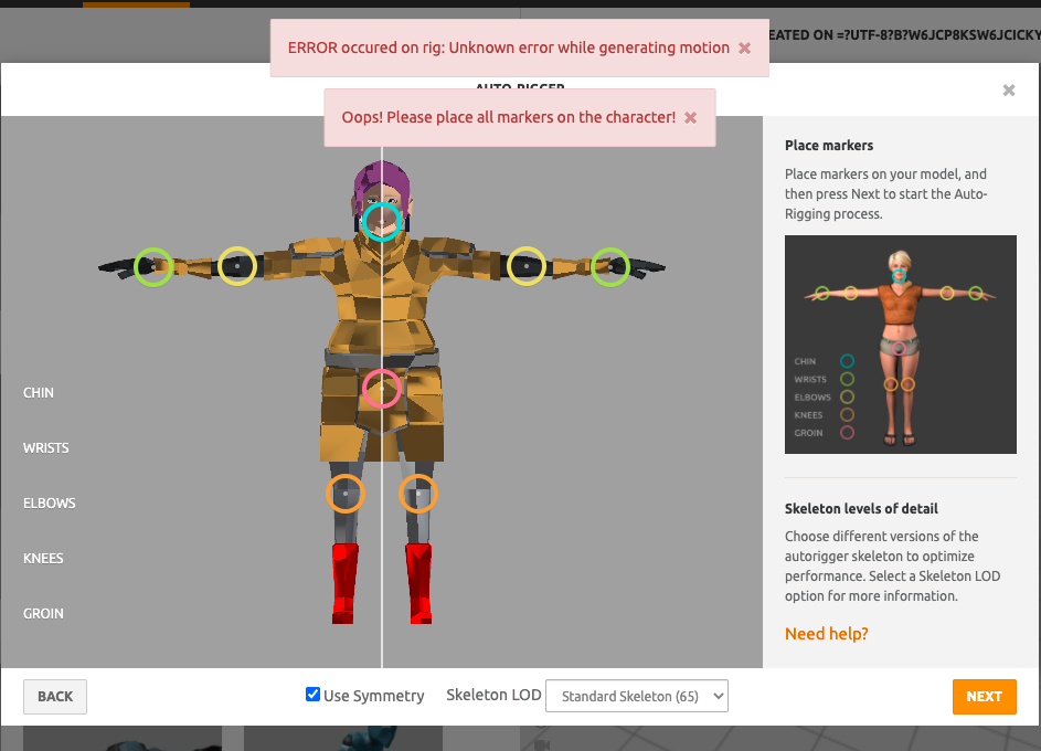 在网站上上传模型,配置关节的位置,官网有提示,操作很简单,而且会自动对称,但只能绑定人型动画