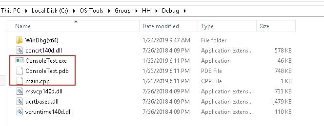 2. 将编译生成的exe和pdb文件以及WinDBG程序拷贝目标机器上,如果需要源码调试,顺便将相关的源码文件一同拷贝过去