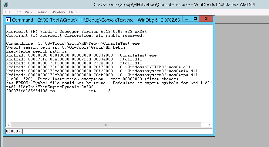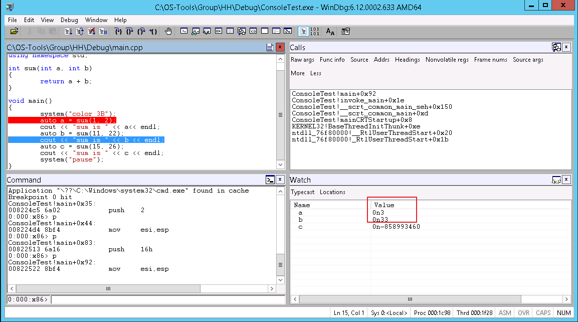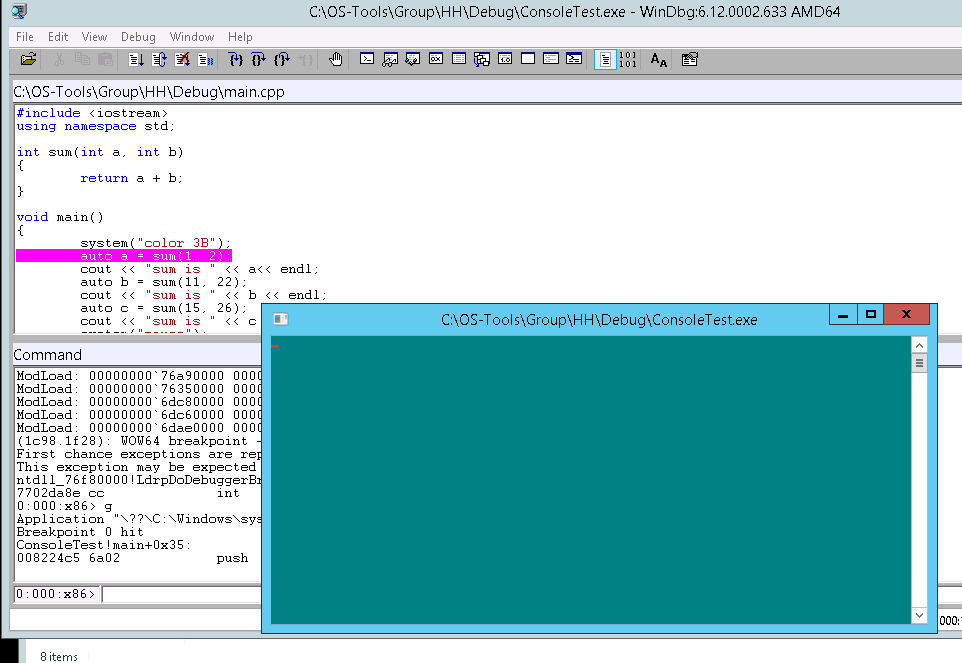 7. 执行g命令或者F5,这里第一次就是main函数之前 WinDBG自动断点,之后再按一次F5才会到我们设定的断点处