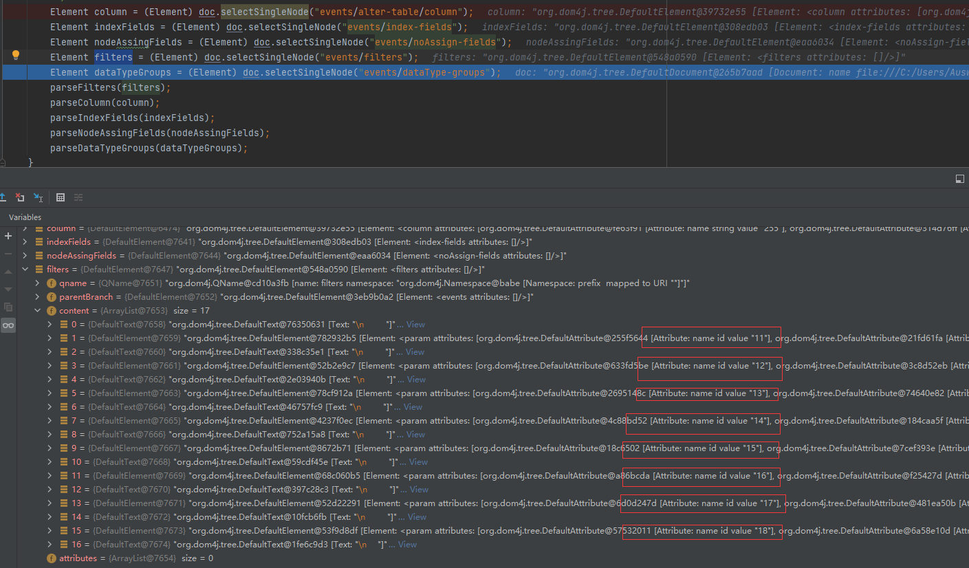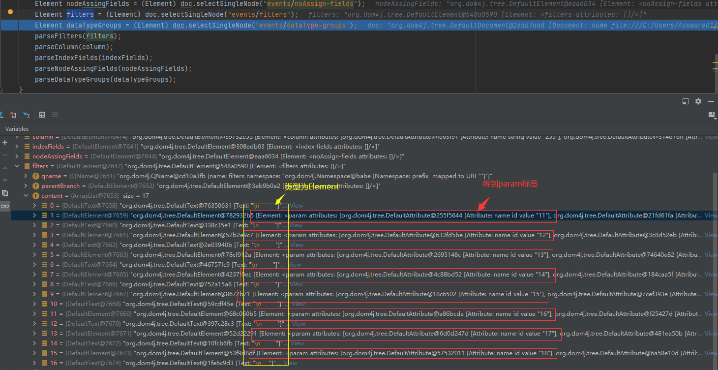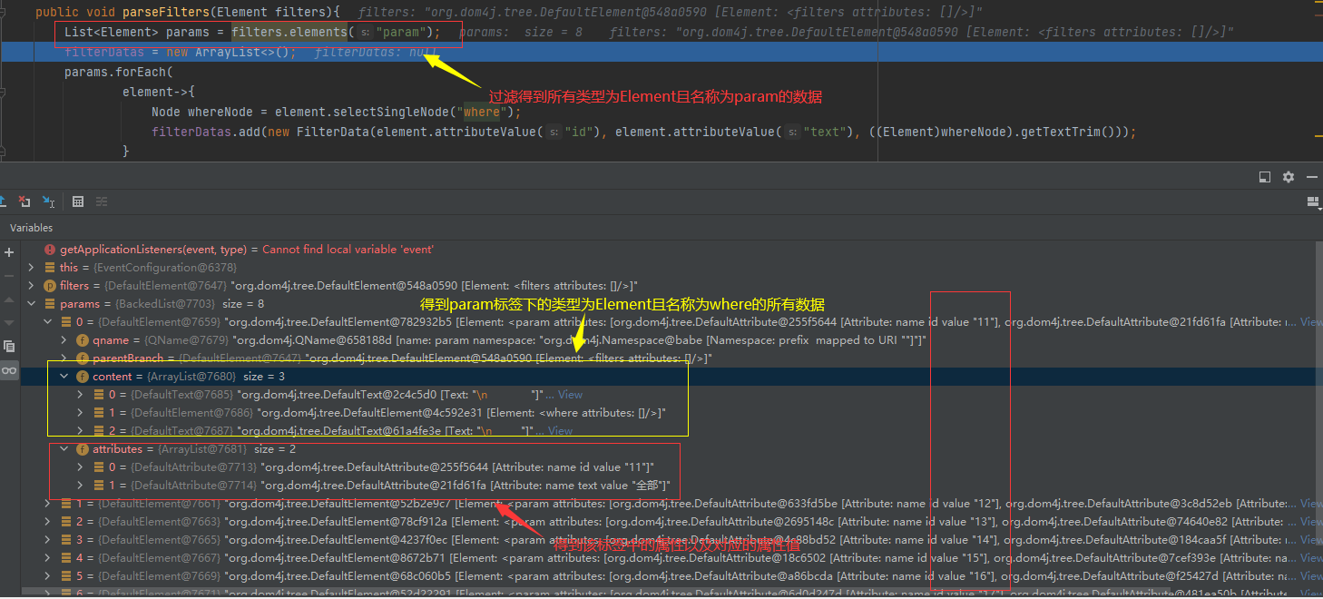 public class EventConfiguration{private List<FilterData> filterDatas;private static EventConfiguration _instance = null;private int stringFieldLength = 255;private String numberFieldType ="bigint";private int ipFieldLength =255;private Map<String,String> indexField;private Set<String> noAssignFields;private List<EvtDataTypeGroupEntity> evtDataTypeGroups;public EventConfiguration() {}/*** 获取事件配置的实例* @return 事件配置的实例*/public static final EventConfiguration getInstance(){if (_instance == null){synchronized (EventConfiguration.class){if (_instance == null){_instance = new EventConfiguration();_instance.loadXML();}}}return _instance;}public void loadXML() {//创建SAXReader对象SAXReader reader = new SAXReader();Document doc = null;try {//读取配置文件doc = reader.read(new File("C:\\Users\\Ausware01\\Desktop\\spring-course\\spring-beanInjection\\src\\main\\resources\\iSmartOne-events.xml"));} catch (DocumentException e) {e.printStackTrace();}/*** * 为什么能将Node转为Element: interface Element extends Branch extends Node 父类转 * 为子类**/Element column = (Element) doc.selectSingleNode("events/alter-table/column");Element indexFields = (Element) doc.selectSingleNode("events/index-fields");Element nodeAssingFields = (Element) doc.selectSingleNode("events/noAssign-fields");//读取的内容见下面图形1Element filters = (Element) doc.selectSingleNode("events/filters");Element dataTypeGroups = (Element) doc.selectSingleNode("events/dataType-groups");parseFilters(filters);parseColumn(column);parseIndexFields(indexFields);parseNodeAssingFields(nodeAssingFields);parseDataTypeGroups(dataTypeGroups);}private void parseDataTypeGroups(Element dataTypeGroups) {evtDataTypeGroups = new ArrayList<>();List<Element> elements = dataTypeGroups.elements("dataType-group");System.out.println(elements);elements.forEach( ele ->{EvtDataTypeGroupEntity evtDataTypeGroupEntity = new EvtDataTypeGroupEntity();//获取Type属性if (org.apache.commons.lang3.StringUtils.isNumeric(ele.attributeValue("type"))) {evtDataTypeGroupEntity.setType(ele.attributeValue("type"));}//获取size属性Element groupItems = ele.element("groupItems");if (org.apache.commons.lang3.StringUtils.isNumeric(groupItems.attributeValue("size"))) {evtDataTypeGroupEntity.setSize(Integer.valueOf(groupItems.attributeValue("size")));}//获取item属性List<Element> items = groupItems.elements("item");if (!ObjectUtils.isEmpty(items)) {ArrayList<Map<String, String>> gorupItems = new ArrayList<>();items.forEach(item ->{HashMap<String, String> map = new HashMap<>();String name = item.attributeValue("name");map.put("name",name);Node content = item.selectSingleNode("content");if (content == null){map.put("content", org.apache.commons.lang3.StringUtils.EMPTY);}else {String textTrim = ((Element) content).getTextTrim();map.put("content",textTrim);}gorupItems.add(map);});evtDataTypeGroupEntity.setGroupItems(gorupItems);}//获取unableFields属性Element unableField = ele.element("unableFields");List<Element> unableFields = unableField.elements("field");if (!ObjectUtils.isEmpty(unableFields)){List<String> unableList = new ArrayList<>();unableFields.forEach(item ->{String name = item.attributeValue("name");unableList.add(name);});evtDataTypeGroupEntity.setUnableFields(unableList);}evtDataTypeGroups.add(evtDataTypeGroupEntity);});}private void parseNodeAssingFields(Element nodeAssingFields) {List<Element> elements = nodeAssingFields.elements("field");noAssignFields = new HashSet<>();elements.forEach(item->{noAssignFields.add(item.attributeValue("name"));});}private void parseIndexFields(Element indexFields) {List<Element> elements = indexFields.elements("field");indexField = new HashMap<>();for (Element element : elements) {String name = element.attributeValue("name");String value = element.attributeValue("value");indexField.put(name,value);}}private void parseColumn(Element column) {stringFieldLength = Integer.parseInt(column.attributeValue("string"));numberFieldType = column.attributeValue("number");ipFieldLength = Integer.parseInt(column.attributeValue("ip"));}public void parseFilters(Element filters){//读取的内容见下面的图形2List<Element> params = filters.elements("param");filterDatas = new ArrayList<>();params.forEach(element->{Node whereNode = element.selectSingleNode("where");filterDatas.add(new FilterData(element.attributeValue("id"), //读取的内容见下面的图形3
