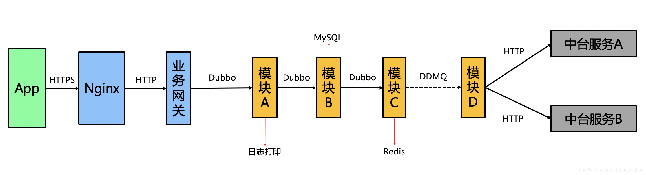 上图最左边的App指的是用户手机中装的App,从后面的链路我们可以看出,业务网关后面就是我们的服务端系统,各模块之间使用Dubbo来进行交互,当然异步用的是DDMQ,而当模块需要使用集团的中台服务时,我们使用的是HTTP。模块内部还使用了线程池,也使用了MySQL、Redis等外部服务。