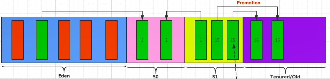 4、我们继续不断的进行对象生成和垃圾回收,当Survivor中的对象的年龄达到15的时候,将会触发一次 Promotion 晋升的操作,也就是将年轻代中的对象晋升到老年代中.