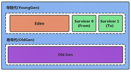 3、其中年轻代又可以划分为Eden空间、Survivor0空间和Survivor1空间(有时也叫做from区、to区,这两个区的大小是相等的)