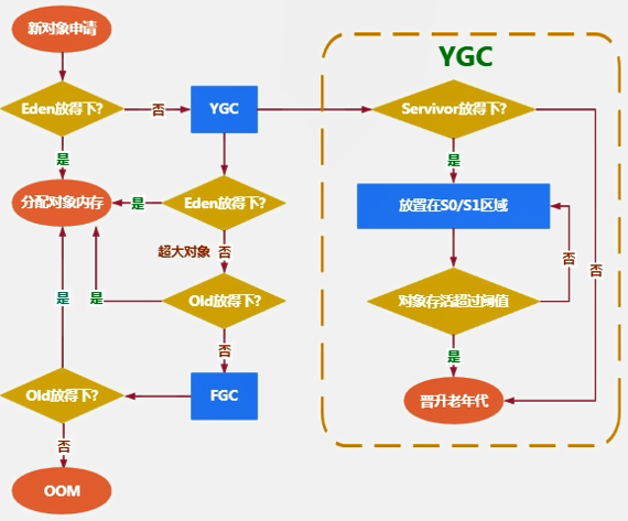 1、我们创建的对象,一般都是存放在Eden区的,当我们Eden区满了后,就会触发GC操作,一般被称为 YGC / Minor GC操作。