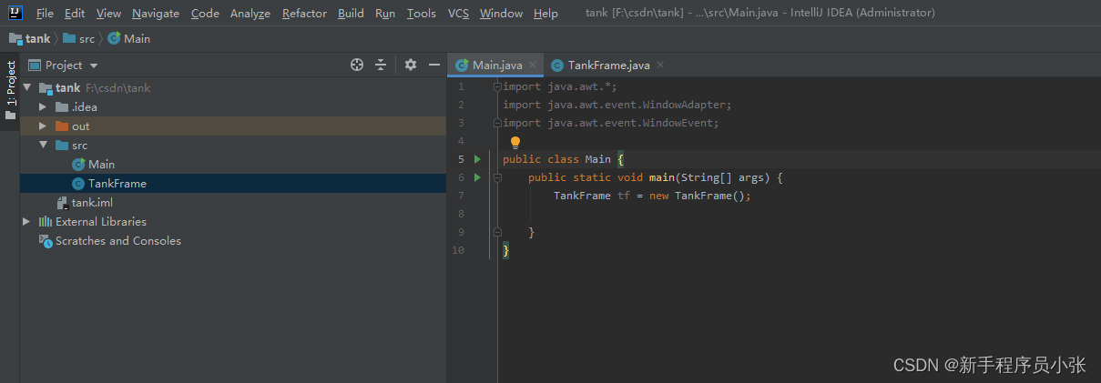 public class TankFrame extends Frame {public TankFrame(){setSize(800,600);//设置窗口大小setResizable(false);//设置为false后不能改变大小setTitle("tank war");//设置窗口标题为tank warsetVisible(true);//设置是否显示addWindowListener(new WindowAdapter() { //创建一个监听器如果用户点击X后调用windowClosing@Overridepublic void windowClosing(WindowEvent e) {System.exit(0);}});}}