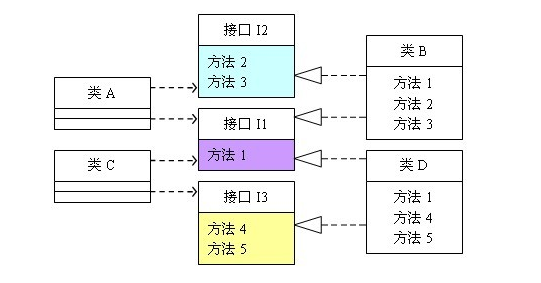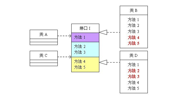 具体来说:类A依赖接口I中的方法1、方法2、方法3,类B是对类A依赖的实现。类C依赖接口I中的方法1、方法4、方法5,类D是对类C依赖的实现。对于类B和类D来说,虽然他们都存在着用不到的方法(也就是图中红色字体标记的方法),但由于实现了接口I,所以也必须要实现这些用不到的方法。对类图不熟悉的可以参照程序代码来理解,代码如下: