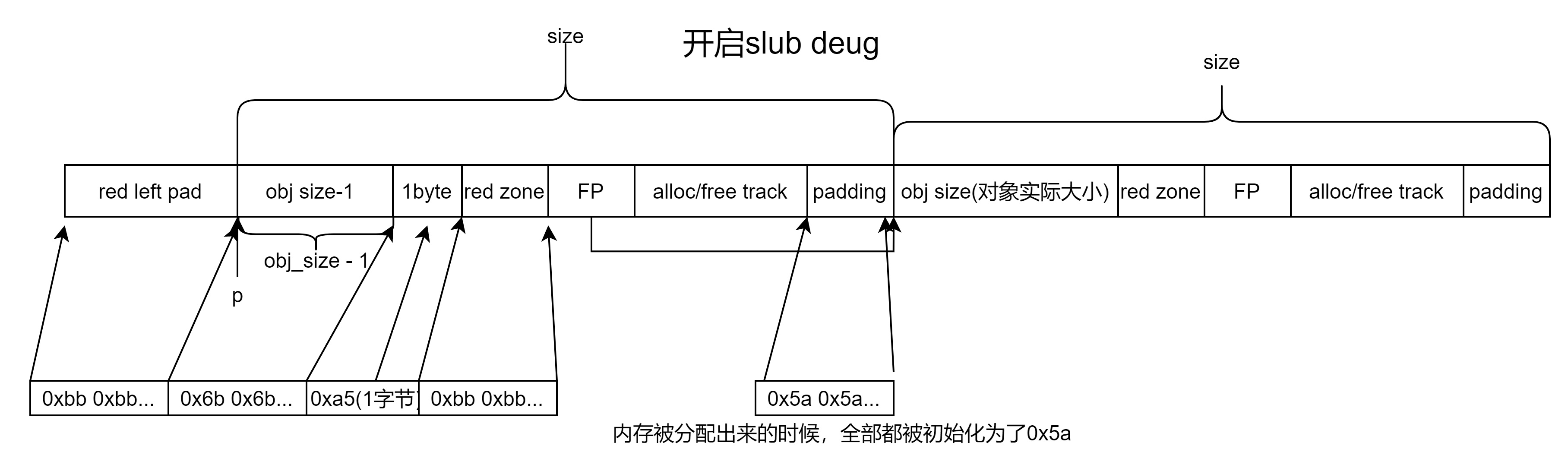 {u8 *p = object;if (s->flags & SLAB_RED_ZONE)memset(p - s->red_left_pad, val, s->red_left_pad);if (s->flags & __OBJECT_POISON) {memset(p, POISON_FREE, s->object_size - 1);p[s->object_size - 1] = POISON_END;}if (s->flags & SLAB_RED_ZONE)memset(p + s->object_size, val, s->inuse - s->object_size);