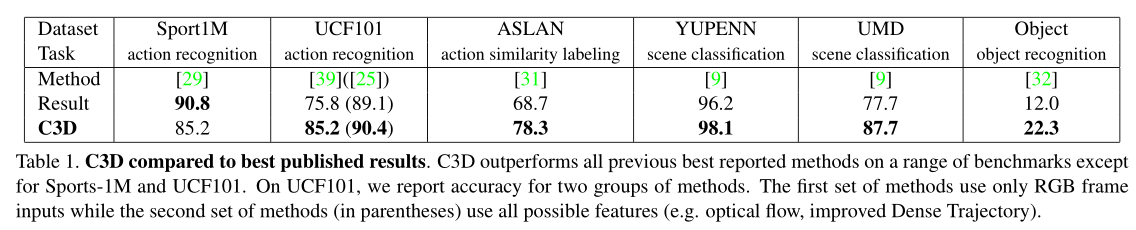 比较C3D与最好的公开结果。在一系列的基准上,C3D优于所有先前最好的报告方法,除了Sports-1M和UCF101。