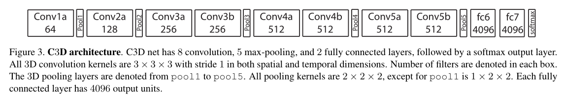 - 所有3D卷积核均为3×3×3(d x k x k ,d为时间深度),步长为1×1×1