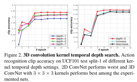 表明当卷积网络中所有的3D卷积核的时间深度一致,都为3×3×3时,效果最优。