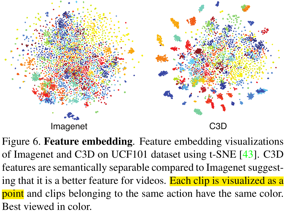 通过从UCF-101中随机取100k个视频片段,再分别取ImageNet和C3D的特征提取片段的fc6特征,用 t-SNE 降维到2维空间进行可视化。