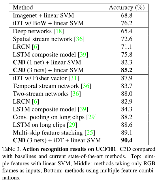 C3D (3 nets) + linear SVM 表示三组C3D的fc6同时并联,与SVM结合后能提高预测精度