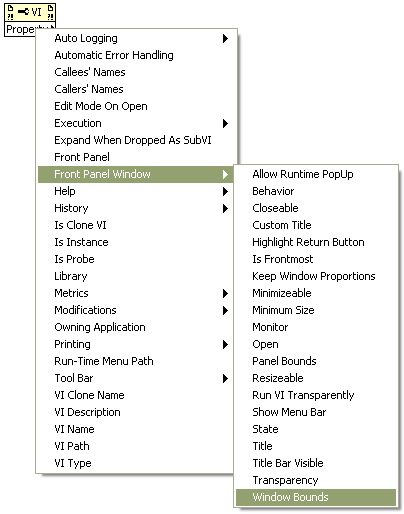 现在,删除窗口边界的显示控件。 将窗口边界属性转换为写入并连接一个常量。将该常量设定为先前运行中得到的您所希望的数值,则前面板将保持在该位置。