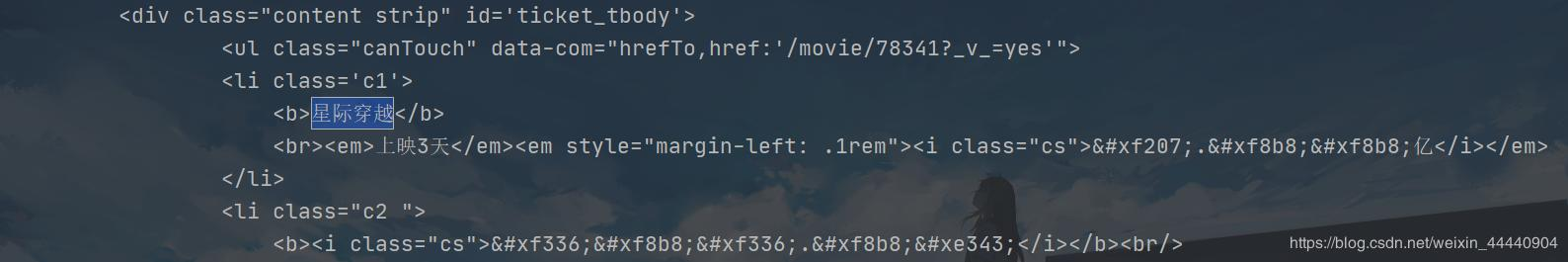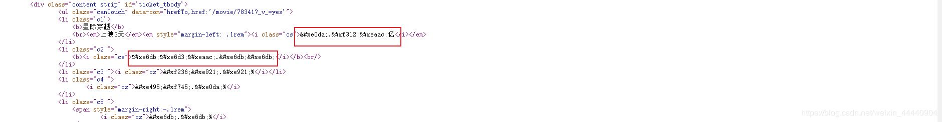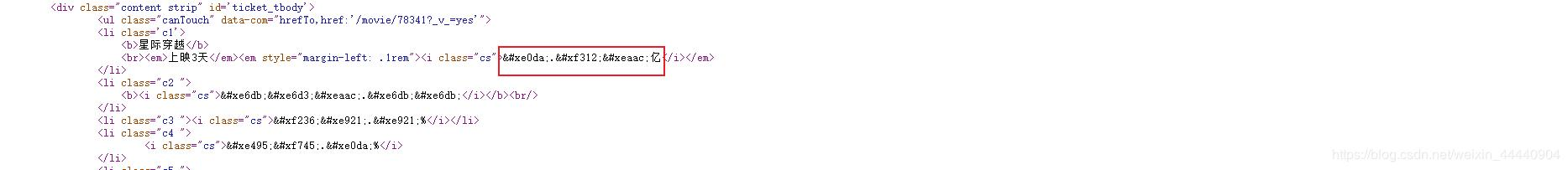 import requestsclass MYSpider(object):"""爬取猫眼即将上映页面"""def __init__(self):# 请求urlself.url = "https://piaofang.maoyan.com/?ver=normal&isid_key=2d9aacd2f26d4d0dba63"# 请求头self.headers = {"User-Agent": "Mozilla/5.0 (iPhone; CPU iPhone OS 11_0 like Mac OS X) AppleWebKit/604.1.38 (KHTML, like Gecko) Version/11.0 Mobile/15A372 Safari/604.1",}# 建立字体文件对象base_font = TTFont("maoyan_pf.woff")# 获取name和形状之间的关系base_glyph = base_font["glyf"]# 组装出基础映射字典self.base_num_glyph_map = {0: base_glyph["uniF1DD"],1: base_glyph["uniE09F"],2: base_glyph["uniEF13"],3: base_glyph["uniED29"],4: base_glyph["uniEE6F"],5: base_glyph["uniE853"],6: base_glyph["uniF44B"],7: base_glyph["uniEF72"],8: base_glyph["uniF814"],9: base_glyph["uniF466"],}def run(self):"""开始爬取"""# 发送请求response = requests.get(url=self.url, headers=self.headers)# 打印获取的HTMLprint(response.text)if __name__ == '__main__':my = MYSpider() # 创建爬虫对象my.run() # 运行爬虫