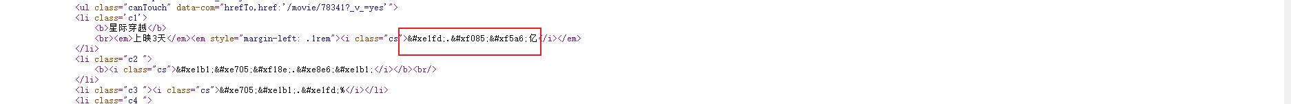 6.点击左上角重新请求这个网站,数据还是这些数据,这时候我们在右击查看源代码,找到一个有反爬字体的地方和font,和前一个网页源代码进行比较,可以发现同样的数据,但编码号变了,base64加密后的font也变了,这就是本次猫眼爬虫的另外一个难点,即每次重新请求都会有一套新的编码和字体文件