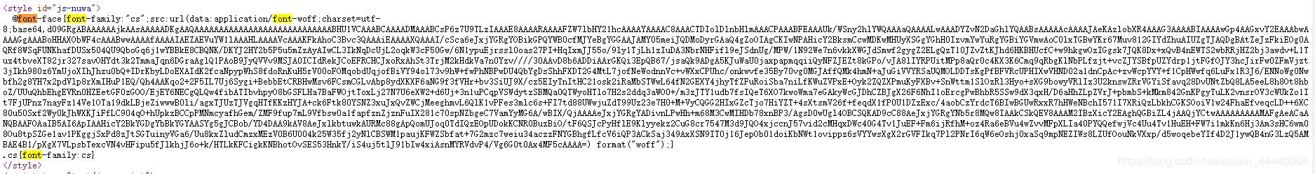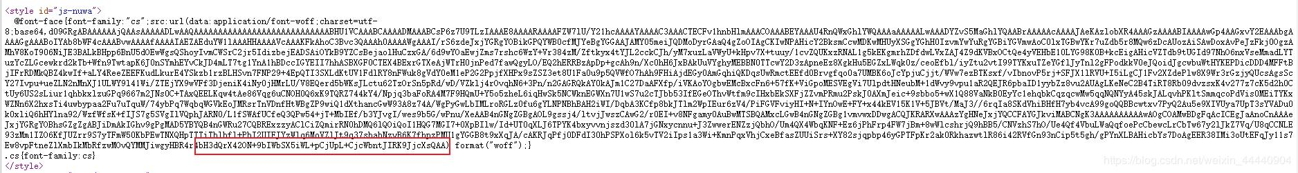 - 观察源代码里面的加密字体是从base64, 开始到 ) 结束的这一段就是加密字体