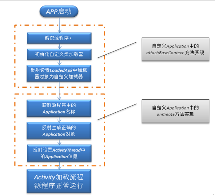 1>、通过反射置换android.app.ActivityThread 中的mClassLoader为加载解密出APK的DexClassLoader,该DexClassLoader一方面加载了源程序、另一方面以原mClassLoader为父节点,这就保证了即加载了源程序又没有放弃原先加载的资源与系统代码。