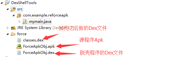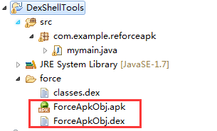 运行源程序和脱壳程序项目,之后得到这两个文件(记得将classes.dex文件改名ForceApkObj.dex),然后使用加壳程序进行加壳:
